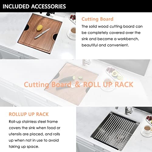 🛠️【WORKSTATION Sink】: Front and back ledges provide rails for accessories like an integrated cutting board and roll-up stand, which doubles as a drain tool for draining cups or other items, and a cutting board that covers the entire sink, allowing you to take it out when you need it Sink becomes countertop.