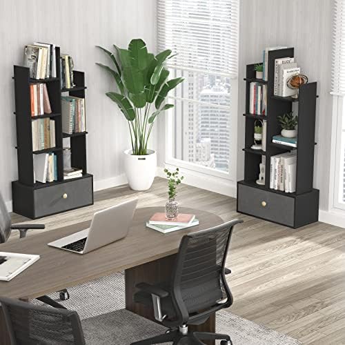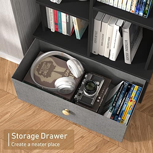 Unikito Bookshelf with Drawer, Free Standing Bookcase with Storage, Open Book Shelf Organizer, Industrial 7 Open Book Shelves, Display Wood Book Case for Bedroom, Living Room, Home Office, Black