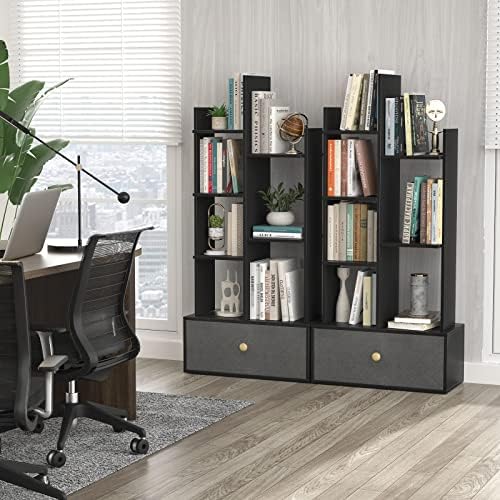 Unikito Bookshelf with Drawer, Free Standing Bookcase with Storage, Open Book Shelf Organizer, Industrial 7 Open Book Shelves, Display Wood Book Case for Bedroom, Living Room, Home Office, Black