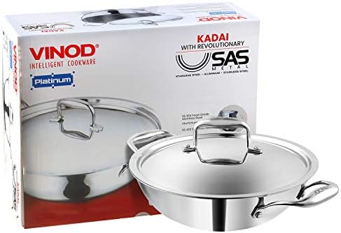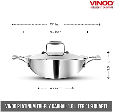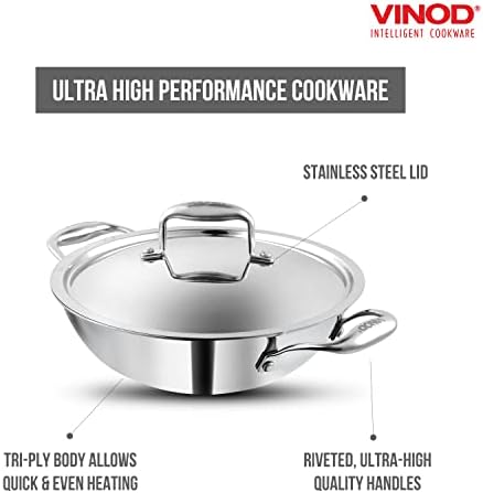 Vinod Platinum Triply Stainless Steel Kadai with Lid: Diameter- 22 cm, Capacity 1.8 Liter (1.9 Quarts)