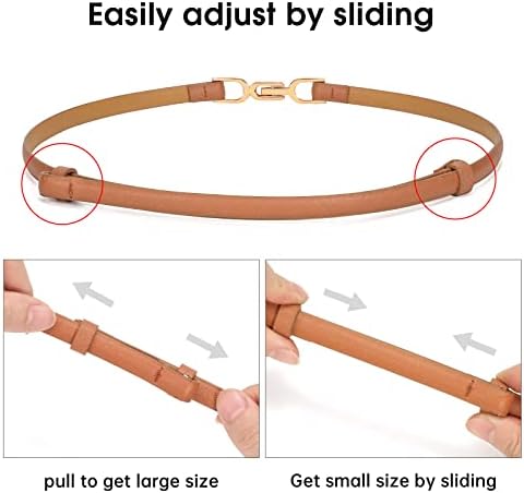[Easy adjustable size]: The thin waist belt is easy to adjust to your size and it stays in place.You will love the adjustable design of this belt. The classic buckle is easy to close and the leather is good looking.The skinny width fits the belt loops on different pants and it is very comfortable.It’s design is very simplistic and modern, so you can pretty much pair it with anything and any style of dress.