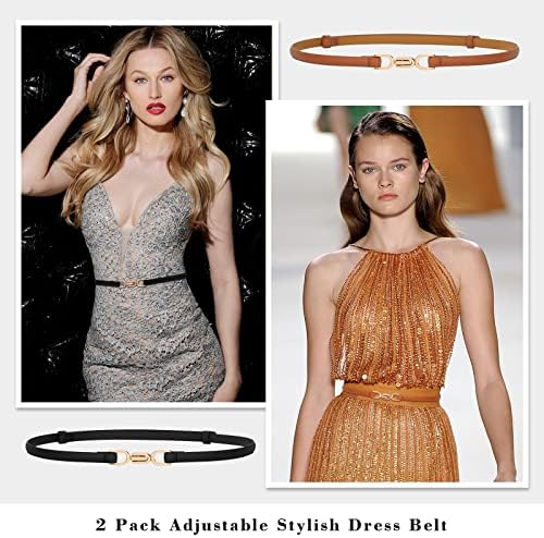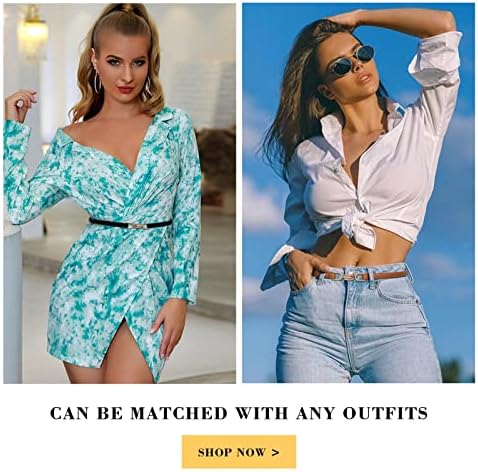 [Golden Alloy Buckle]:Our skinny dress belt is with classy interlocking buckle, easy to wear or take it off.This belt adds a cute flair to your outfit.The golden alloy buckle design also makes the belt more beautiful and compliments every clothes style.It adjusts really well to fit your waist and the buckle stays in place.Adjustable, great fit, and they don’t slip when they’re on!