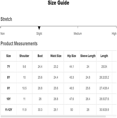 Bust Size: (7Y) 24.4 inch; (8Y) 25.6 inch; (9Y) 26.8 inch; (10Y) 287 inch; (11-12Y) 30.3 inch