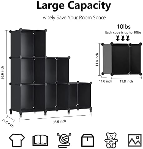 Wolizom Cube Storage Organizer, 6-Cube Black Closet Storage Shelves, Modular Units, Closet Cabinet, Portable DIY Plastic Book Shelf Shelving for Bedroom, Office, Living Room (12"X12"X12")