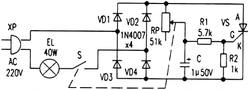 🎯【1】:Bulb, switch S, rectifier tubes D1~D4, thyristor Q406 and power supply form the main circuit; the trigger circuit is formed by potentiometer RP1A, capacitor C1, resistors R1 and R2.
