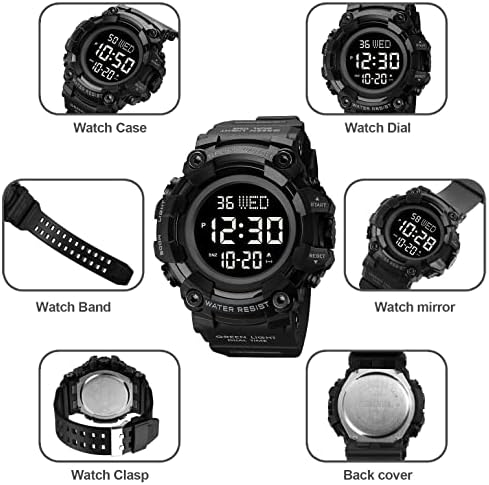 ❤Multifunction Digital Watch: 1. Analog dial 2. Alarm 3. LED Back Light(show time clear in the dark ) 4. Calendar Day and Date 5. Stop Watch 6. 12/24H format option 7. Shock Resistant. Those funktions make it perfect for all kind of sport and daily use.
